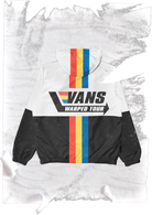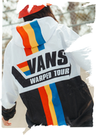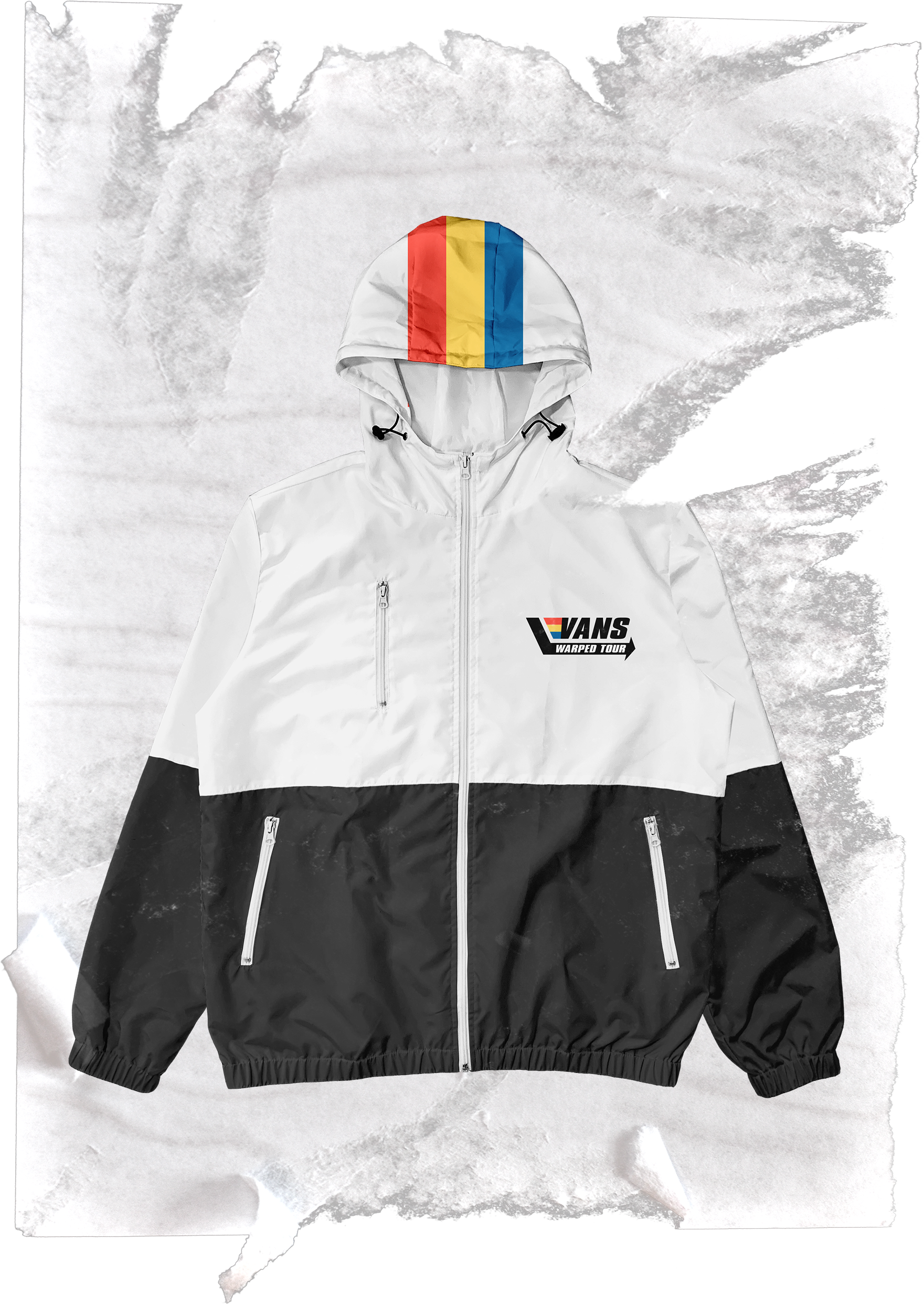 Keep the energy high and the elements out with the Vans Warped Tour Retro Film Windbreaker — a lightweight, street-style essential celebrating the legacy of the legendary tour. Designed with a striking half-white, half-black color block, this jacket features bold vertical stripes in red, yellow, and blue running from hood to hem for a true retro statement.