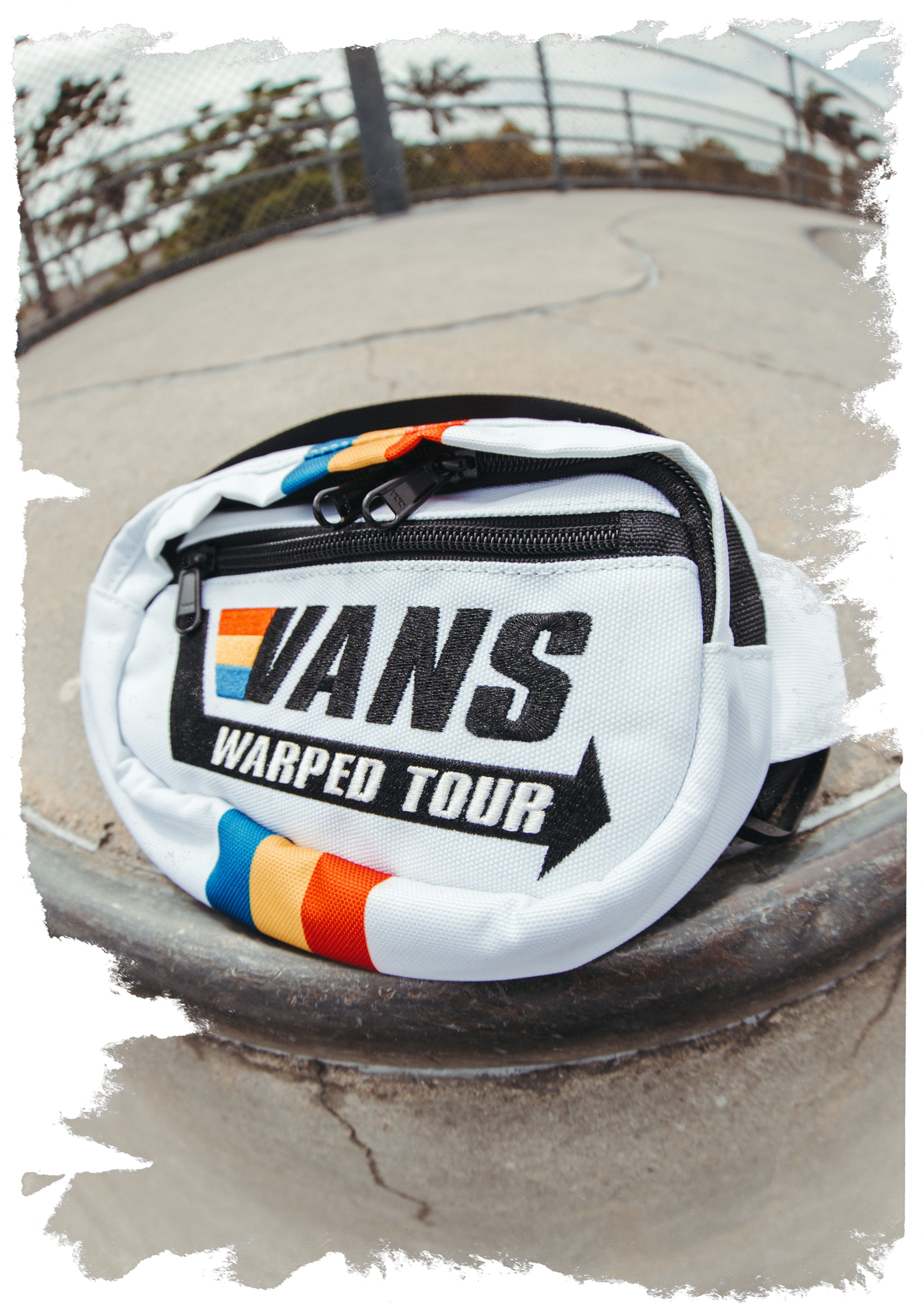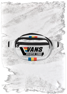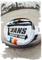 Hit the festival circuit in style with the official Vans Warped Tour Retro Film Fanny Pack — a bold throwback to one of music's most iconic tours. Featuring a clean white base with a striking black zipper and strap, this compact pack is accented with vibrant retro stripes in blue, yellow, and red for a pop of color that screams vintage cool.